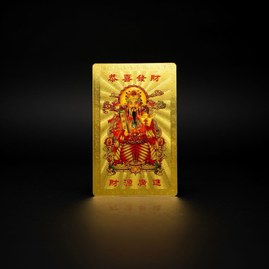 - Tarjeta de Cai Shen: para atraer prosperidad, estabilidad y bendiciones mientras te mantienes protegido. Colócala en tu altar, cartera o cerca de donde descansas y frota suavemente su pancita mientras afirmas tu intención de salud y resguardo.